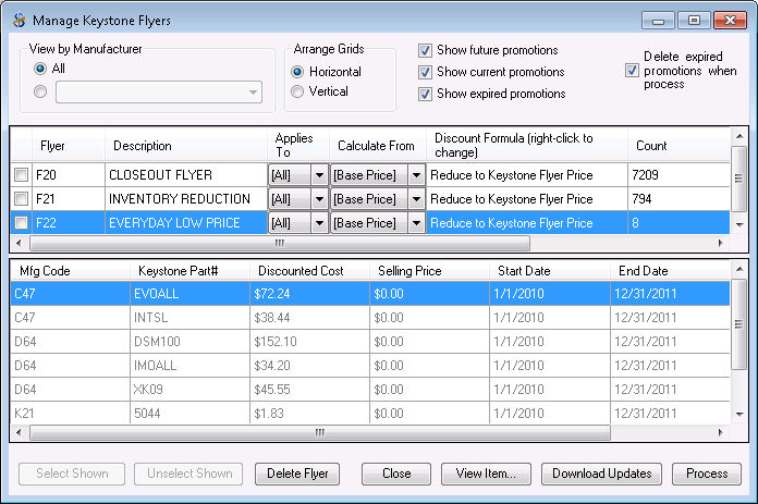 Always click Process after downloading new Flyers or making changes to existing Flyers. Since the promotions are entered with a range of dates, they do not need to be deletesd after the promotions expire.