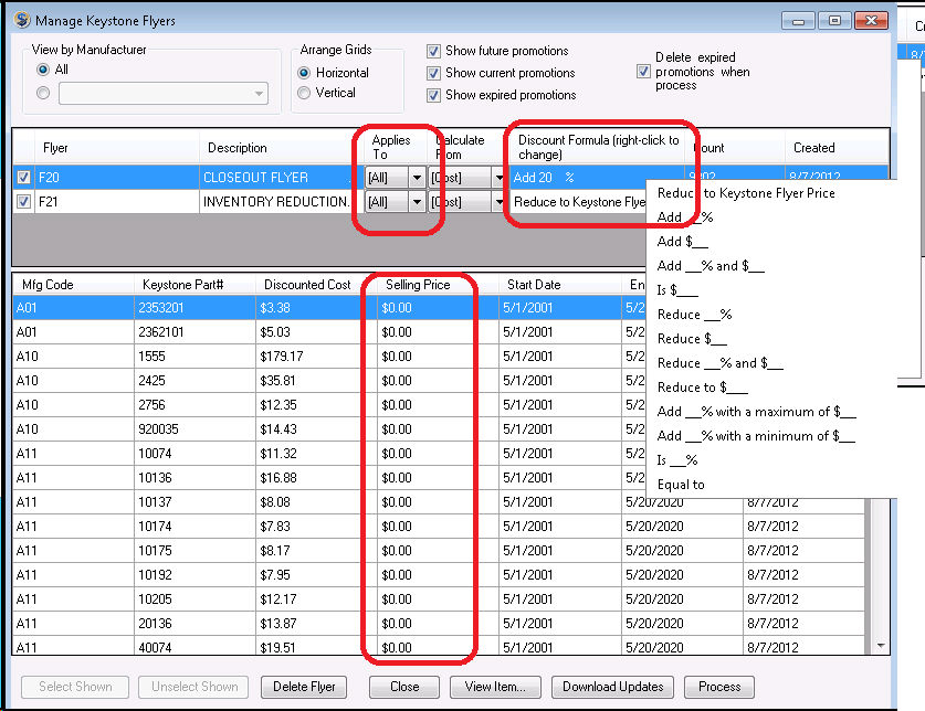 If Reduce to Keystone Flyer Price is used and the regular retail price is lower, EBMS will not raise the price. Therefore, any Keystone flyer price that is greater than the current price will be unaffected. Pricing will always be discounted.