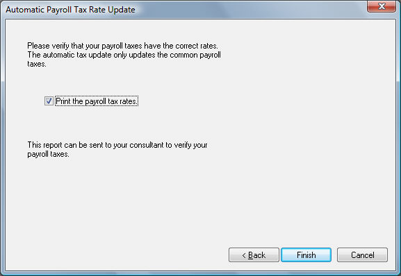 This step will print a list of all the payroll rates AFTER the new rates have been updated. Disable the Print the payroll tax rates to abort the printing of the tax rate report. An accountant or payroll tax consultant should review and verify all rates before any payroll is processed within the New Year.