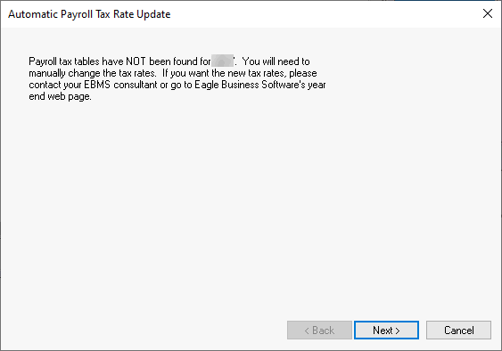 The Automatic payroll tax update wizard is used to update the most common tax and deduction rates within the payroll system with the new year’s rates. Many taxes and deductions such as local income tax and unemployment tax will not be updated. An accountant or tax consultant SHOULD REVIEW ALL RATES. EBMS does NOT CERTIFY THESE RATES and is not liable for any rates used within this software.