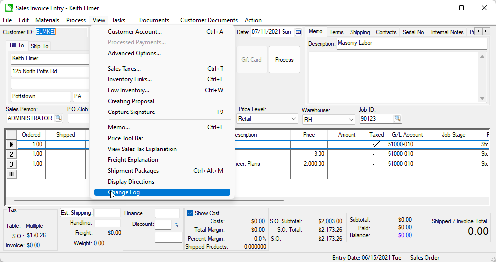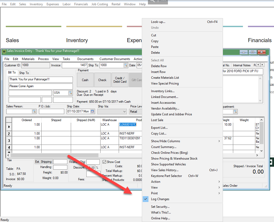 Log changes can also be applied to detail lines within a sales order, purchase invoice, or other document with detail lines. Open the detail line’s context menu to view the logging option.
