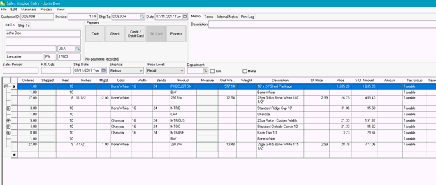 Metal packages allow the user to bundle multiple items within a materials list in a sales order or proposal. This option is useful to create a metal kit based on the building demensions. These materials list may have common color settings or styles. Pricing for the entire kit is listed within the order or quote.