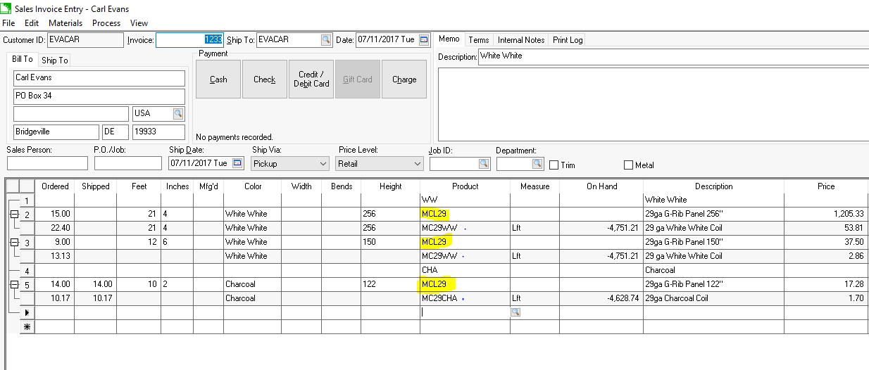 Made-to-order panels classified as No Count products: These items deduct the coil using an invoice materials list which effectively reduces coil stock when the customer is invoiced. A no count item should not be used for stock metal panels. Separate items classified as Special can be used for returned metal that is placed in stock. Review [Inventory] Special Orders > Generic Special Order Items for instructions to track count for various sizes or color of panels using a common inventory item code.