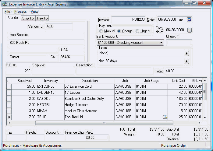 Any direct job costs such as materials should be associated with a job and job stage at the time of purchase. All expenses listed on a purchase order that contain a job code are listed in the job as committed costs until the purchase order is processed. The job and/or stage can be changed until the time the expense invoice is processed.