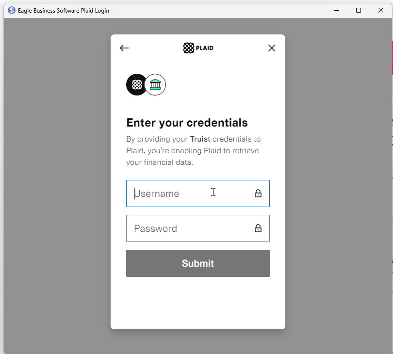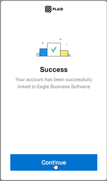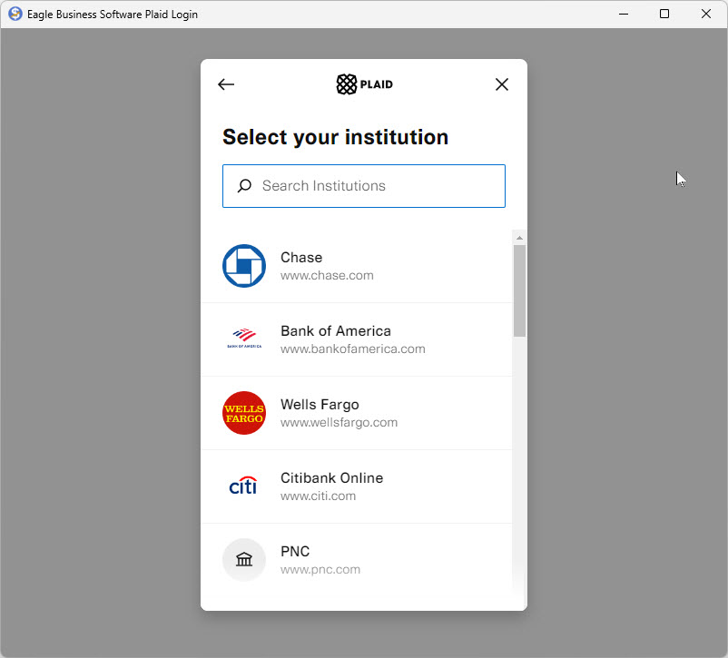 EBMS uses Plaid to download online bank accounts' transactions to the bank feed dialog. EBMS will create a Plaid account for each new bank account that is selected within the bank feed dialog. A quality internet connection and an existing online bank account must be established before continuing with this section. The following online Plaid banner page will appear when connection is made with the Plaid gateway.