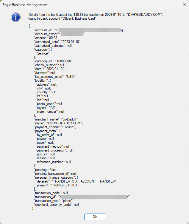 Click Transaction Details to view the detailed transaction downloaded from the bank.