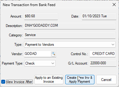 Click either Create New Inv & Apply Payment or Apply to an Existing Invoice to create the payment and open the invoice. Review Expense Invoices > Processing an Invoice or [Sales] Invoices > Processing a Sales Invoice for more details.