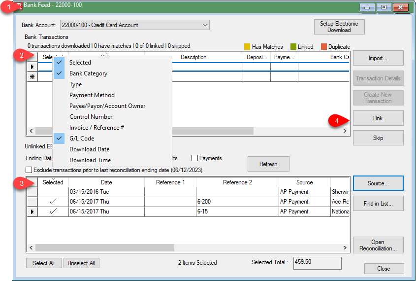 Scroll through transactions and match Bank Feed transactions in the upper pane with the Unlinked EBMS Transactions in the lower pane. Select both transactions using a mouse and click Link to associate transactions and turn them green. Linked EBMS transactions are removed from the lower pane. Click Open Reconciliation to view linked EBMS transactions.