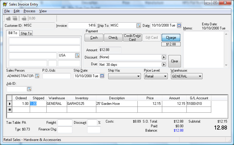 Proceed with the remainder of the invoice in the same way you enter a standard invoice. Review the Invoices > Entering and Printing a Sales Invoice for more details on invoice entry.