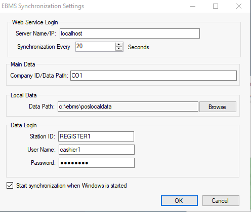Enable the Start synchronization... option so that the sync tool runs when a POS station is started.