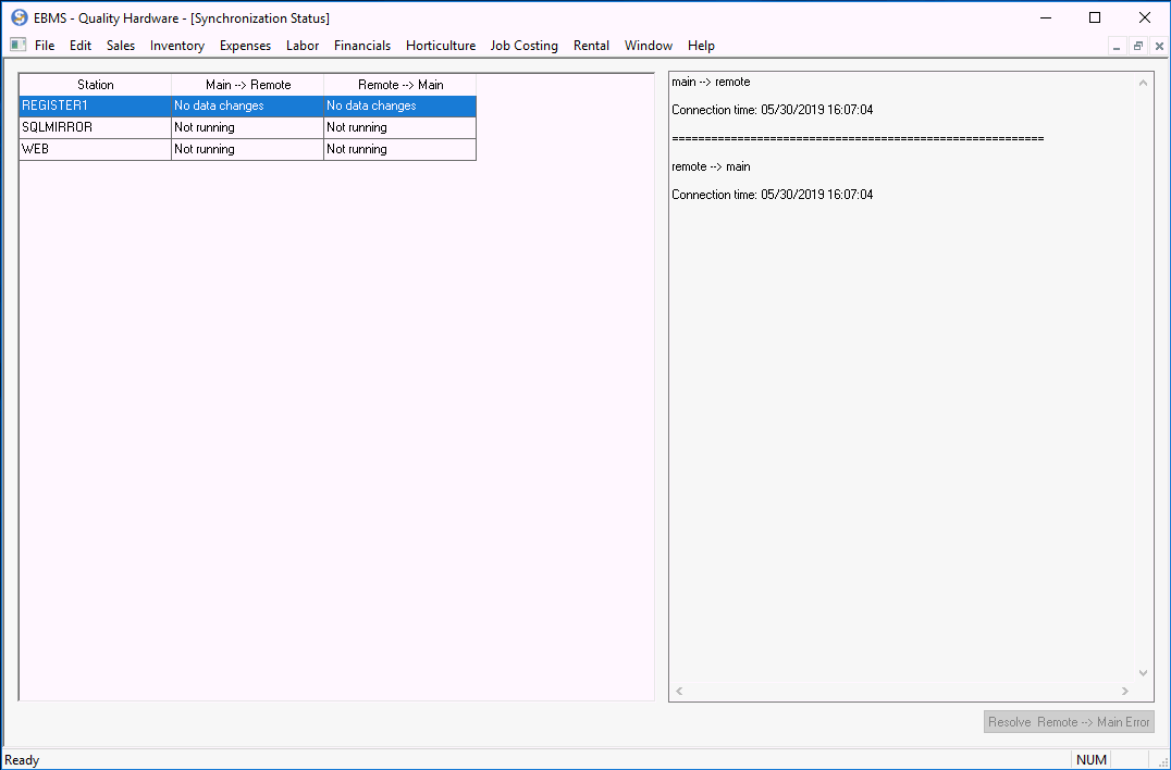 Notice that the status of changes pushed to the client (Main -> Remote) and the changes pushed from the client to EBMS (Remote -> Main) are shown. Additional information is shown on the log pane for each station that is highlighted.